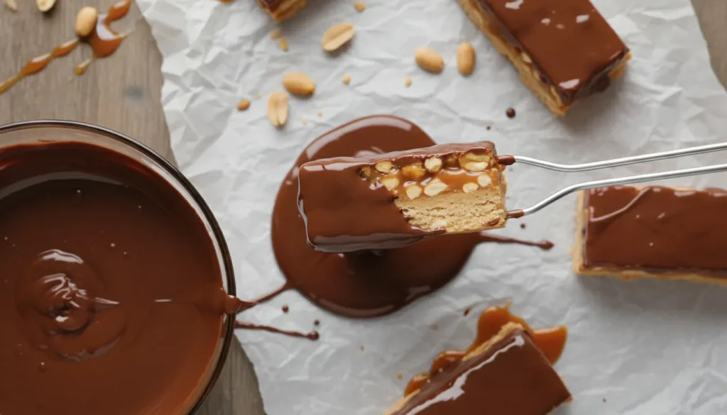 Smooth chocolate coating being applied to homemade Snickers bars