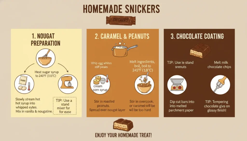 Infographic detailing the step-by-step process of making homemade Snickers bars