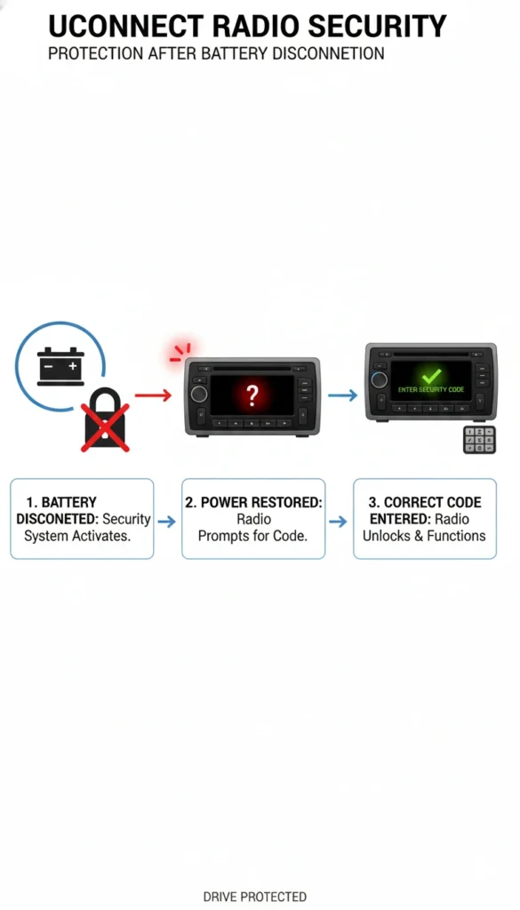 The Uconnect security code is part of Jeep’s anti-theft protocol for the infotainment system. When the vehicle’s battery is disconnected—even briefly—the system assumes it may have been tampered with or stolen. To prevent unauthorized use, it locks the radio, navigation, and touchscreen features until the correct 4-digit code is entered.