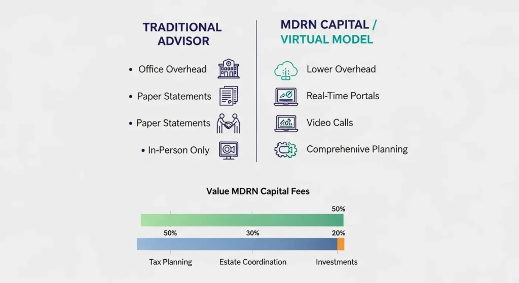 Based on industry benchmarks, a well-run virtual firm like MDRN Capital should offer either lower fees or significantly more value than traditional advisors.