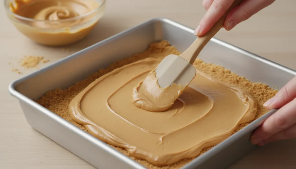 2. Make the filling: Stir peanut butter, sugar, and vanilla until smooth. Spread over crust. Chill 10 min.
