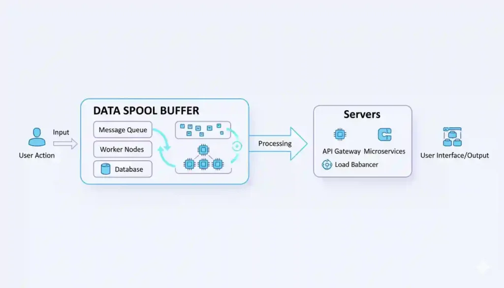 In social media, data spooling ensures that high-volume, real-time actions (e.g., posting a story, uploading a video, or sending a DM) don’t overwhelm backend services. Instead of processing each request instantly, the system “spools” it into a temporary holding area—often a message queue like Apache Kafka or RabbitMQ—where it waits its turn for orderly, efficient handling.